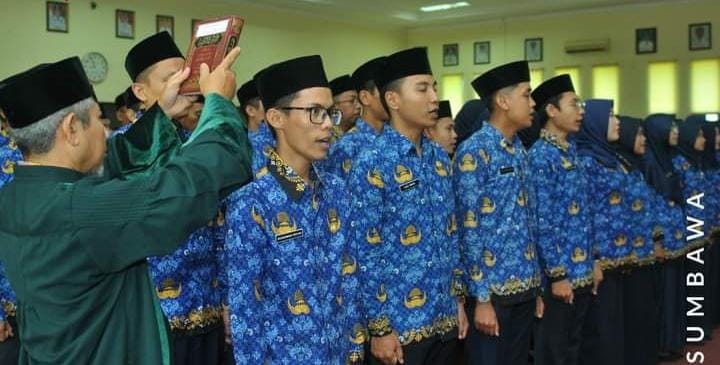 SUMBAWA- “Saya minta kepada PNS di lingkungan Pemerintah Kabupaten Sumbawa, agar selalu belajar, mau berbenah diri, dan senantiasa mengasah diri untuk dapat melaksanakan tugas pemerintahan, pembangunan dan kemasyarakatan sebagaimana mestinya sesuai dengan peraturan yang berlaku,” Pinta Bupati Sumbawa, Drs. H. Mahmud Abdullah usai mengambil sumpah/janji 209 Pegawai Negeri Sipil (PNS) di lingkungan Pemerintah Kabupaten Sumbawa, Rabu, 1 Maret 2023, di Aula H. Madilaoe ADT Kantor Bupati Sumbawa.