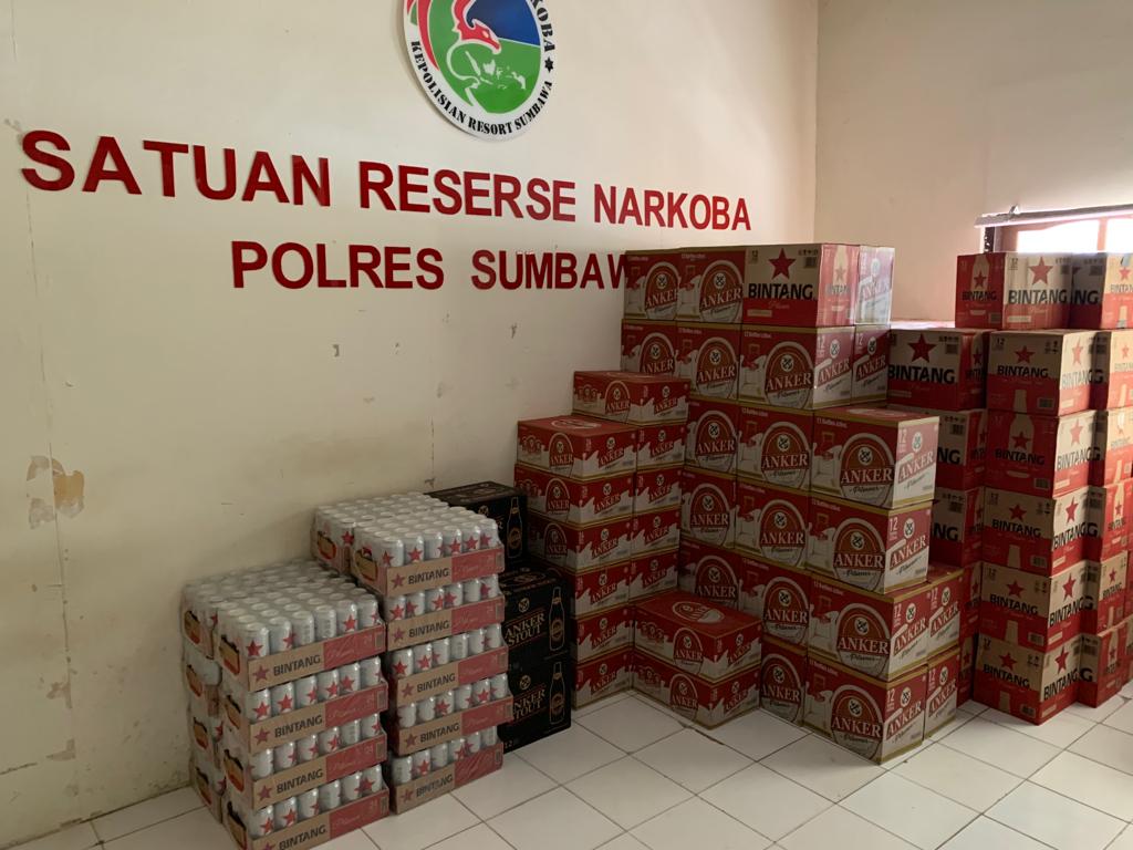 Sebanyak 181 dus miras kemasan botol dan kaleng berhasil di sita personel Sat Resnarkoba dari salah satu gudang ekspedisi di wilayah hukum Polres Sumbawa.