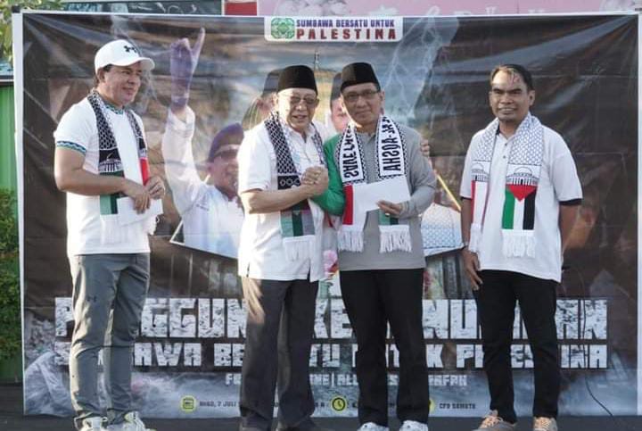 SUMBAWA – Bupati Sumbawa, Drs. H. Mahmud Abdullah hadiri Giat Panggung Kemanusiaan “Sumbawa Bersatu Untuk Palestina”, sekaligus Penggalangan Dana dan Doa Bersama 1 Muharram 1446 H, di Car Free Day Samota, Minggu, 7 Juli 2024.