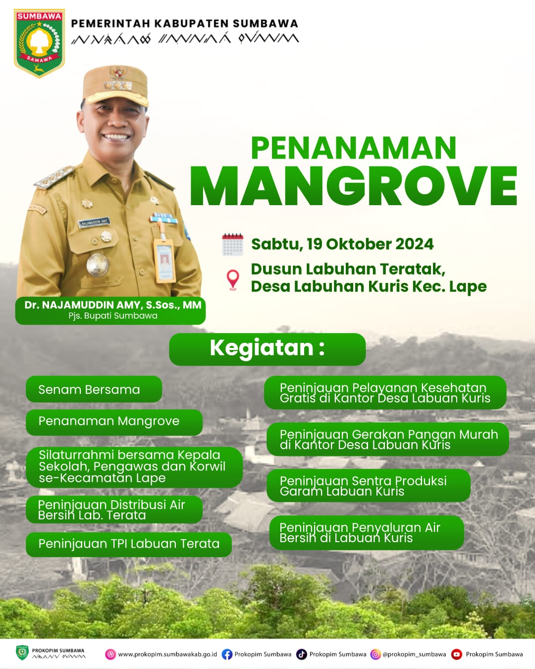 SUMBAWA – Dalam upaya menjaga kelestarian lingkungan pesisir, Pjs Bupati Sumbawa Drs. Najamuddin Amy mengajak seluruh elemen masyarakat untuk berpartisipasi dalam kegiatan penanaman mangrove di Labuhan Terata, Sabtu (19/10/24).