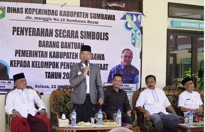 SUMBAWA – Penjabat Sementara (Pjs) Bupati Sumbawa, Dr. Najamuddin Amy, S.Sos., MM., menyerahkan secara simbolis barang bantuan untuk pengembangan usaha kepada 145 kelompok UMKM dan industri di Kabupaten Sumbawa, dengan total bantuan senilai 4,4 miliar rupiah. Penyerahan dilakukan di Dinas Koperidag Kabupaten Sumbawa.