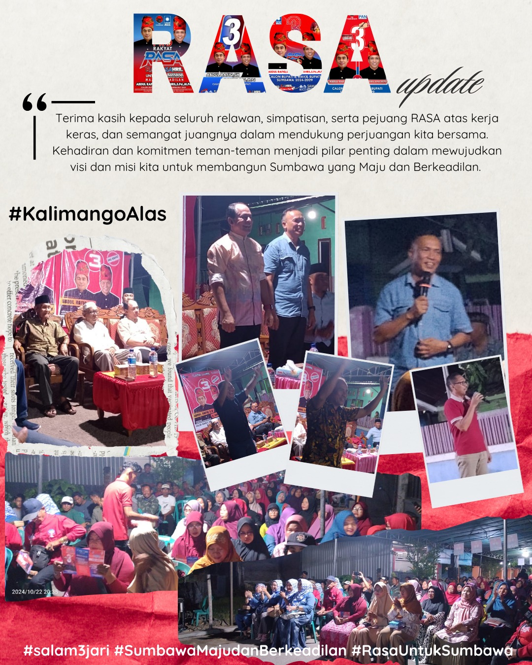 Sumbawa – Pasangan calon Bupati dan Wakil Bupati Sumbawa nomor urut 3, Abdul Rafiq SH dan H. Sahril SPd MPd (RASA), menyampaikan rencana besar mereka untuk masyarakat Alas dalam kampanye tatap muka dengan lebih dari 500 warga di Desa Kalimango, Kecamatan Alas, Senin (23/10/2024).